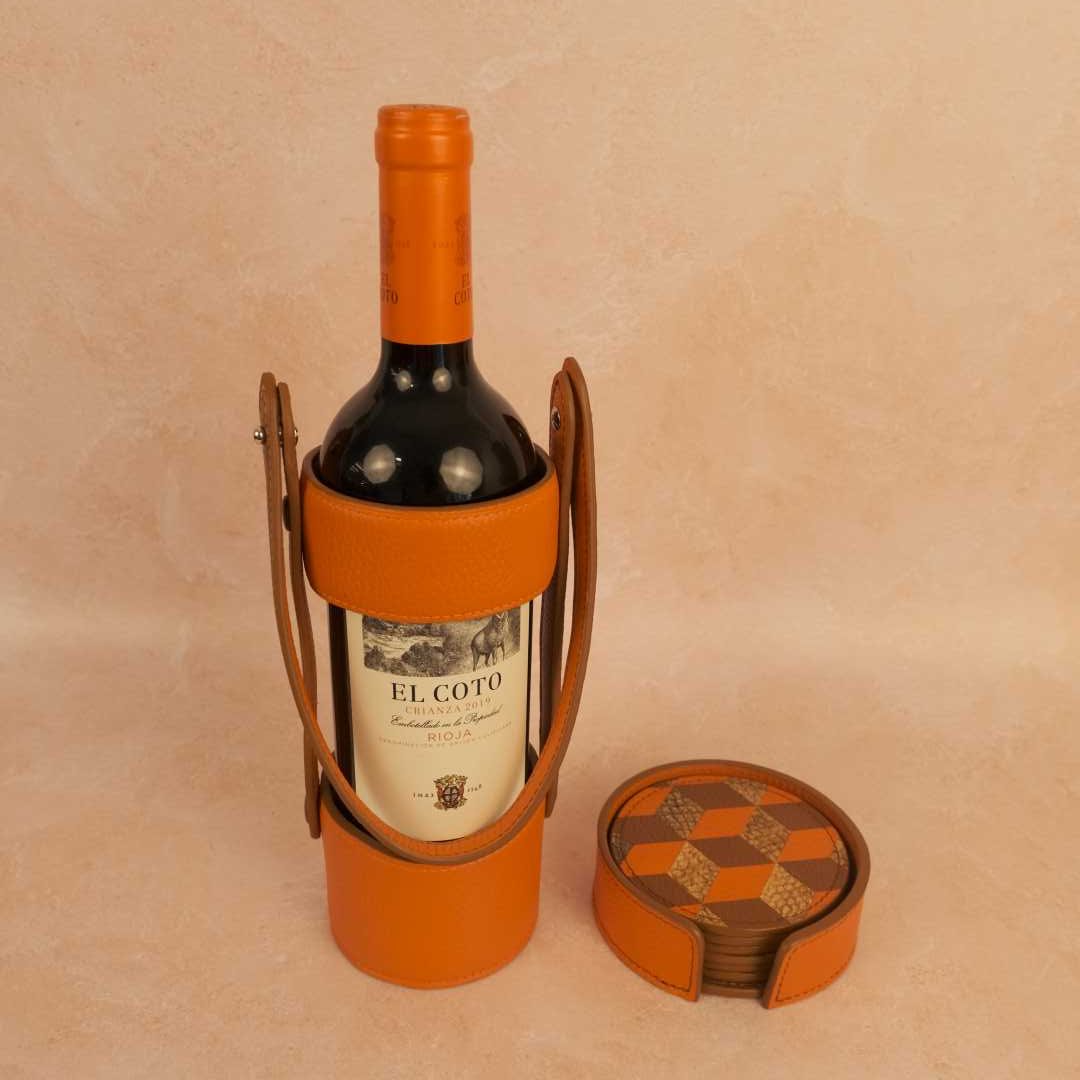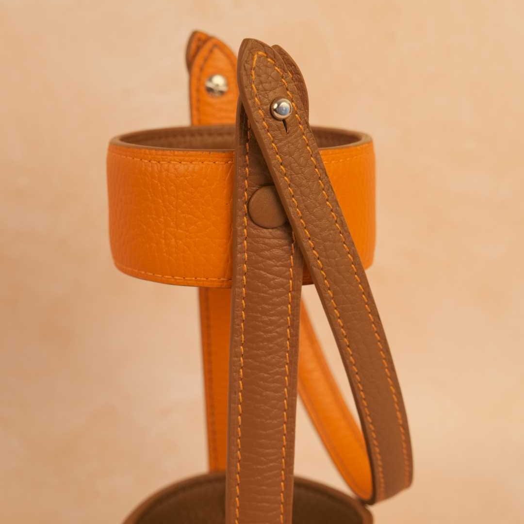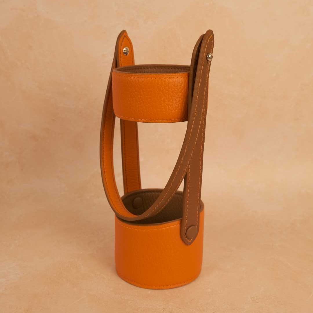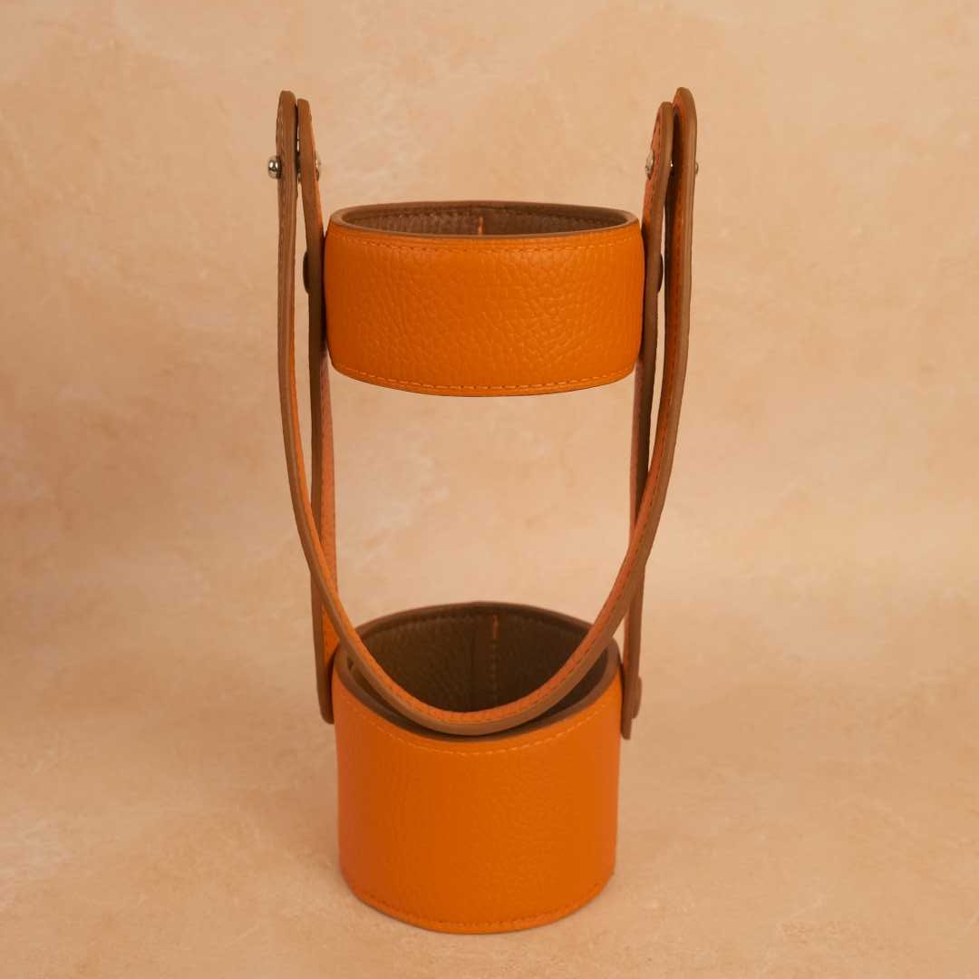 Porte-bouteille en cuir orange et marron de très grande qualité, fabriqué artisanalement. Équipé d’une poignée amovible pour un service élégant, il apportera une touche raffinée et chaleureuse à votre table.