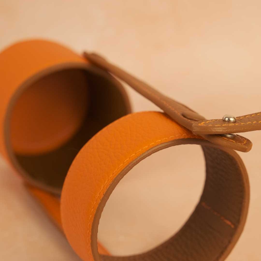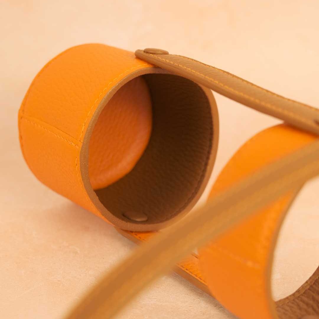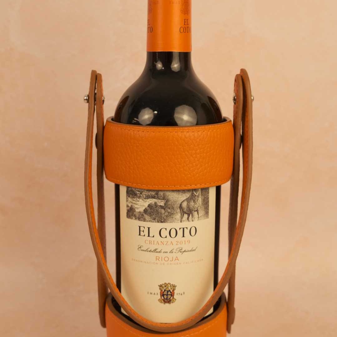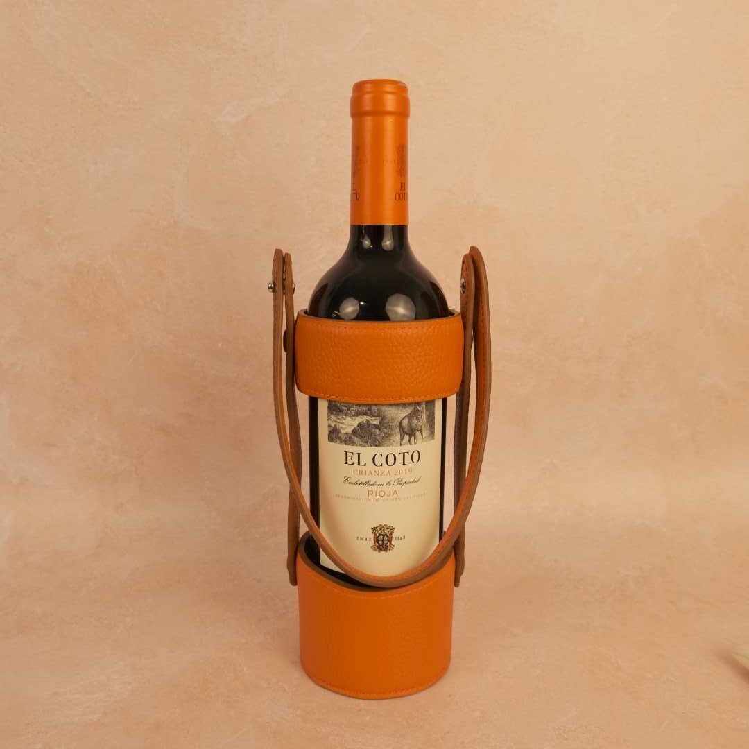 Porte-bouteille en cuir orange et marron de très grande qualité, fabriqué artisanalement. Équipé d’une poignée amovible pour un service élégant, il apportera une touche raffinée et chaleureuse à votre table.